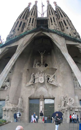 De merveilleuses statues ornent la porte de la Nativité et constituent probablement l'œuvre la plus touchante de Gaudi. La construction de l'édifice est loin d'être achevée. Des projets initiaux de Gaudi, seuls deux éléments ont été réalisés: la porte de la Nativité (œuvre de Gaudi, façade est) et la porte de la Passion (datant de 1986, façade ouest), chacune étant accompagnée de quatre tours.