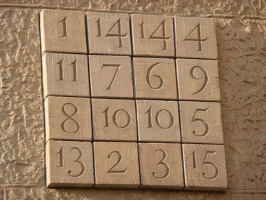 Dans les carrés d'ordre 4, où les nombres sont de façon séquentielle à partir de 1 à 16, la constante magique (la somme d'une seule ligne, colonne ou diagonale) est de 34, mais le carré de Subirachs carré ne contient pas les numéros 12 ou 16 (voir image ci-dessus). Au lieu de cela, 10 et 14 sont inclus deux fois, donnant une constante magique de 33, l'âge de Jésus-Christ à la crucifixion.